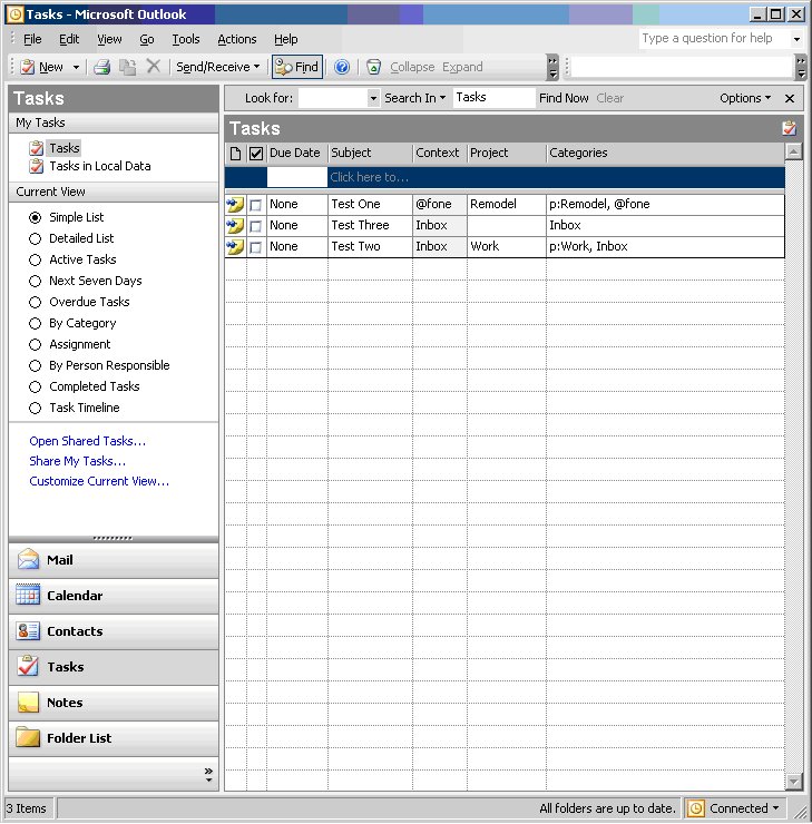 Ok, but I also tried entering a new task from Outlook using the new form, and it's not displaying correctly, either. I see the context and project I entered in the mashed-up Categories field, but they aren't broken out into the new Context and Project fields within Outlook.